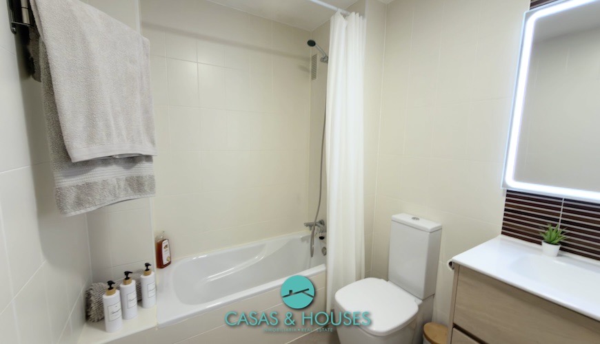 The bathroom includes a bathtub and contemporary finishes that add a fresh and elegant touch.
