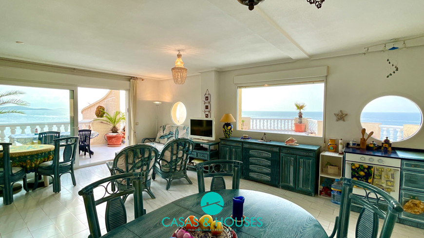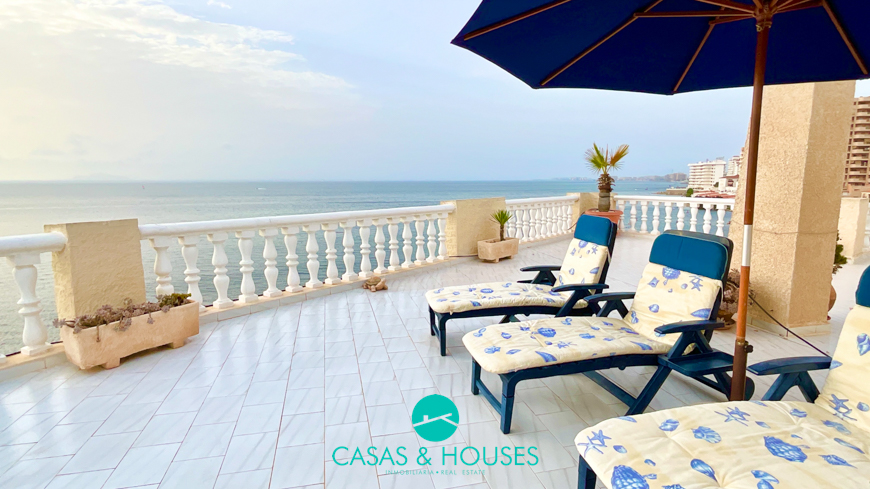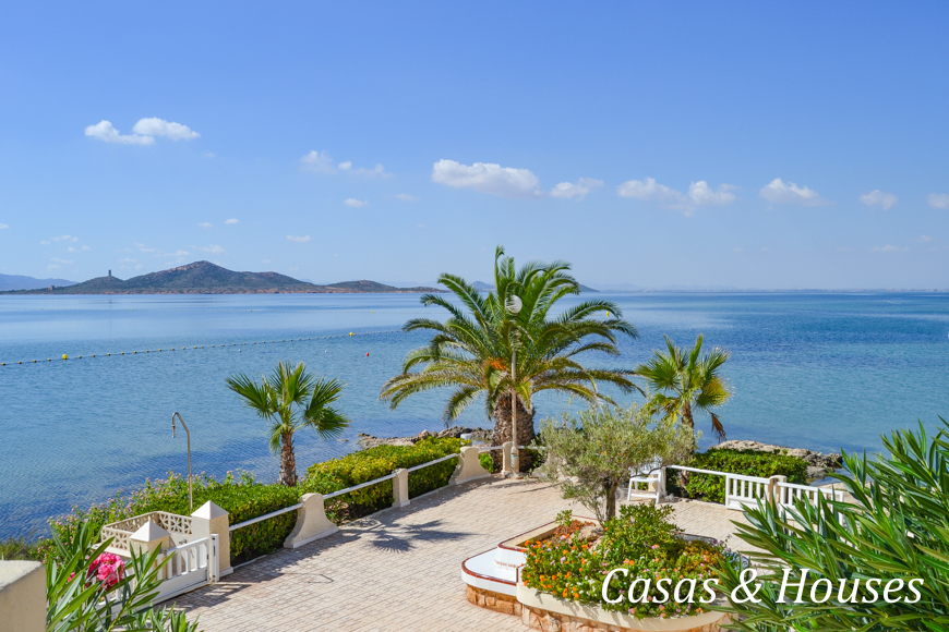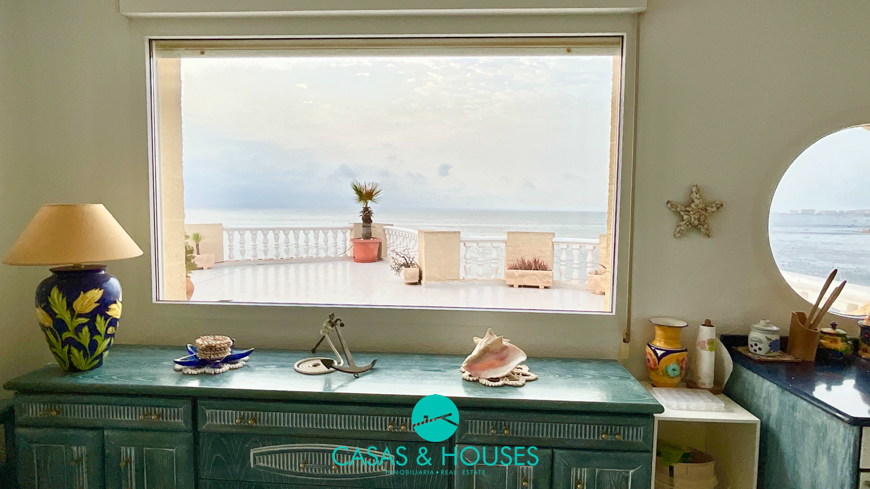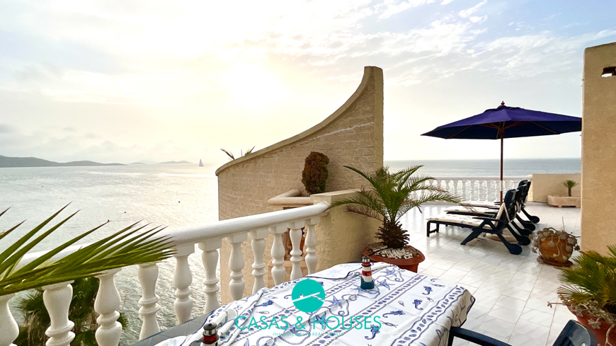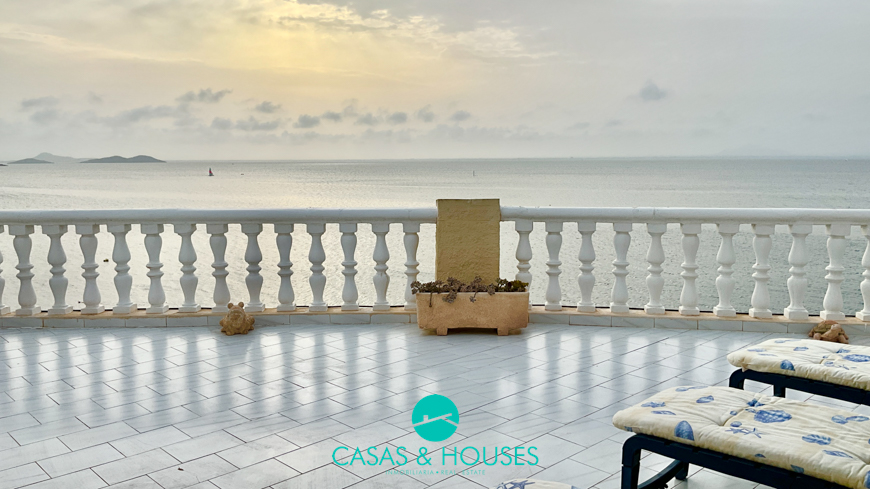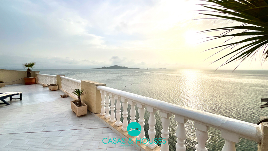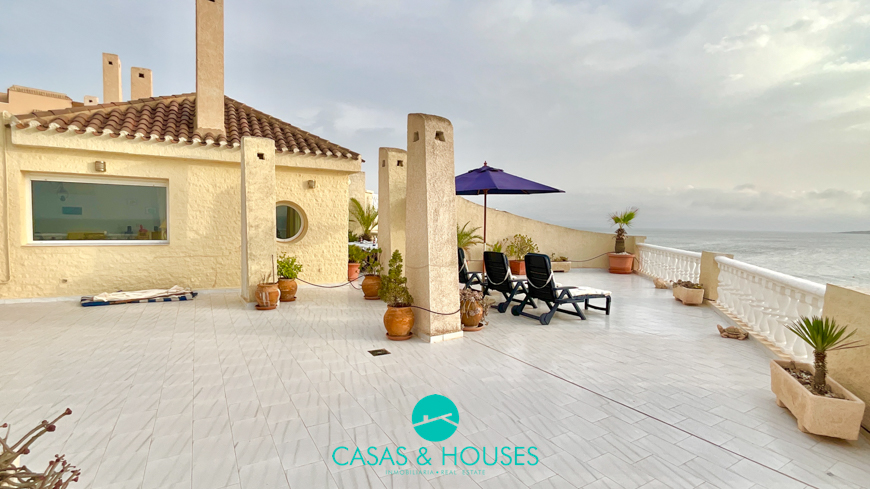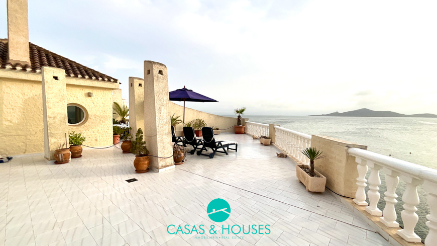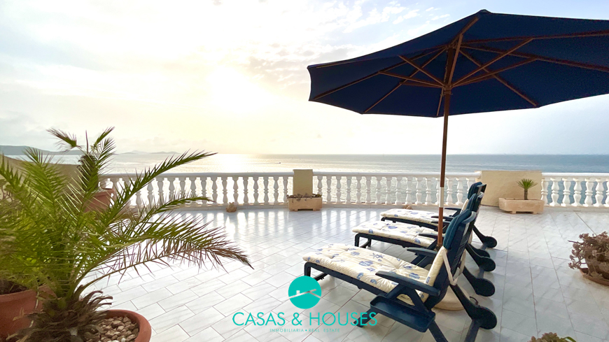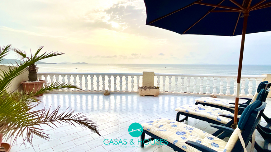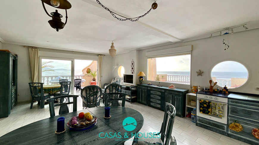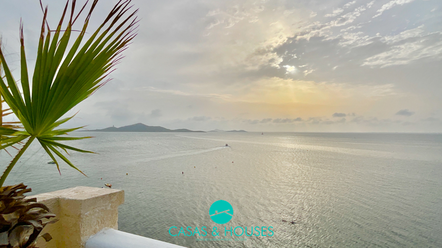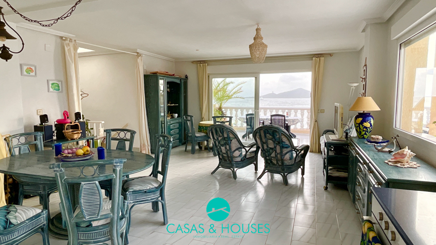 La planta superior dispone de un amplio salón comedor y una gran terraza desde la que podrá disfrutar de unas inmejorables vistas a los dos mares y sus islas de fondo.